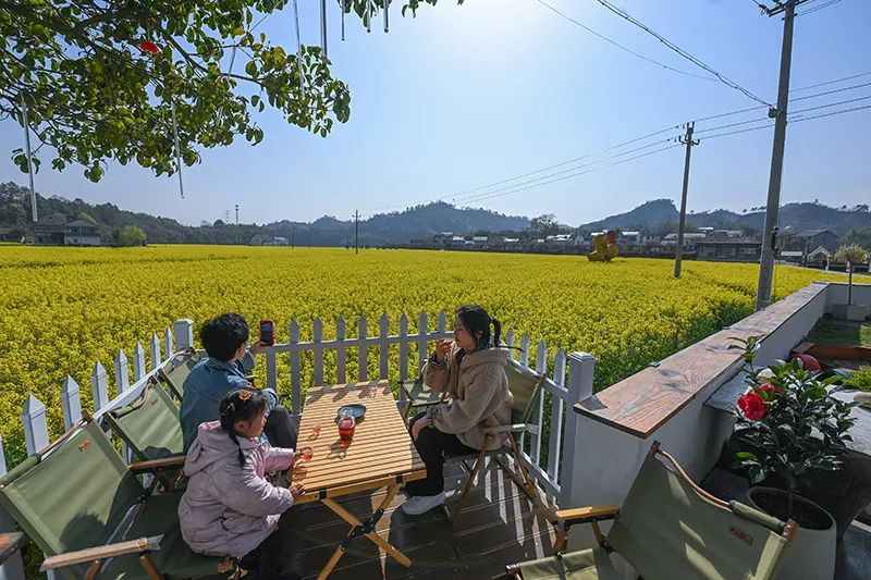 2023年3月28日,在杭州市臨安區太陽鎮太陽米基地旁的一家民宿餐廳,客人在院子里喝茶賞景。新華社記者 徐昱 攝