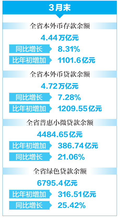 3月末,全省本外幣存款余額4.44萬億元,同比增長8.31%,比年初增加1101.6億元。全省本外幣貸款余額4.72萬億元,同比增長7.28%,比年初增加1209.55億元。