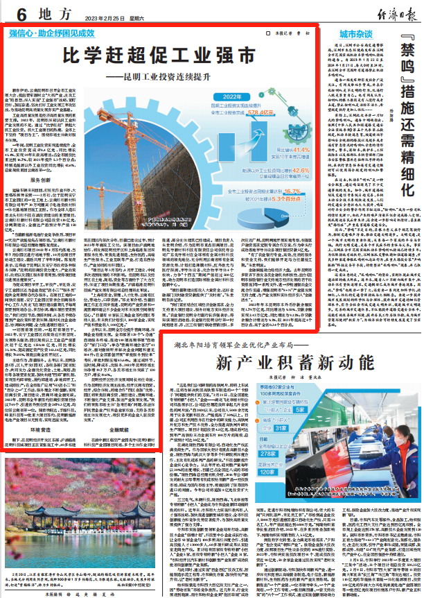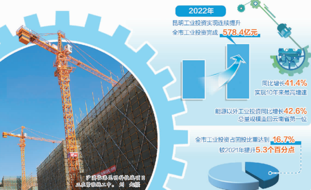 一年間,昆明工業投資實現連續提升,全市工業投資完成578.4億元,同比增長41.4%,實現10年來最高增速;占全市固投比重達到16.7%,較2021年提升5.3個百分點;特別是能源以外工業投資同比增長42.6%,總量規模重回云南省第一位。