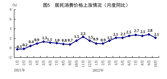 ?1-10月份,全國居民消費價格(CPI)同比上漲2.0%。10月份,全國居民消費價格同比上漲2.1%,漲幅比上月回落0.7個百分點;環比上漲0.1%。分類別看,食品煙酒價格同比上漲5.2%,衣著價格上漲0.5%,居住價格下降0.2%,生活用品及服務價格上漲1.4%,交通通信價格上漲3.1%,教育文化娛樂價格上漲1.2%,醫療保健價格上漲0.5%,其他用品及服務價格上漲1.9%。在食品煙酒價格中,鮮菜價格下降8.1%,糧食價格上漲3.6%,鮮果價格上漲12.6%,豬肉價格上漲51.8%。扣除食品和能源價格后的核心CPI同比上漲0.6%,漲幅與上月持平。