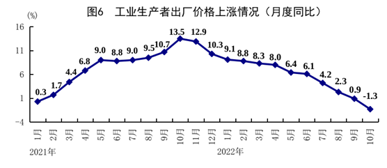 ?1-10月份,全國工業生產者出廠價格、工業生產者購進價格同比分別上漲5.2%、7.5%。10 月份,全國工業生產者出廠價格同比下降1.3%,環比上漲0.2%;工業生產者購進價格同比上漲0.3%,環比上漲0.3%。